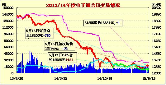 5月13日電子撮合交易成交11200噸,較上一交易日減少2100噸。訂貨量減少760噸,累計訂貨15200噸。交易各合同開盤高低不一,日內(nèi)震蕩下行,均價漲跌互現(xiàn)。據(jù)調(diào)查,雖然5月份以來國內(nèi)棉紡織企業(yè)、棉花經(jīng)營商紛紛派譴采購人員入疆詢價、看貨并少量采購,但仍以“隨用隨買”為主;截止5月中旬前后,庫爾勒、阿克蘇、喀什棉區(qū)棉花播種已全部結(jié)束,由于4-5月中旬南疆沒有出現(xiàn)大的降溫、大風(fēng)、降水天氣,棉花發(fā)芽、出苗長勢非常好,復(fù)播、補(bǔ)苗的情況也很少。