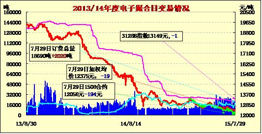7月29日電子撮合交易成交18610噸,較上一交易日減少980噸。訂貨量增加2020噸,累計(jì)訂貨18690噸。交易各合同開盤高低不一,盤中震蕩下行,均價(jià)下跌。今年目前棉花長勢普遍較去年稍好,早熟品種可能會(huì)提前1-2周采摘。北疆地區(qū)受大風(fēng)降雨天氣影響播種較遲,采摘時(shí)間大概在9月中上旬左右,南疆地區(qū)采摘時(shí)間或在8月中下旬左右。