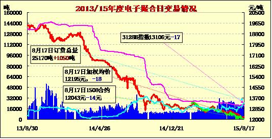 8月17日棉花撮合交易成交16590噸,較上一交易日減少750噸。訂貨量增加1050噸,累計訂貨25170噸。交易各合同開盤高低不一,盤中窄幅震蕩,均價漲跌互現(xiàn)。當日儲備棉輪出成交1175噸,兵團成交1083噸,商品棉成交43噸。進入8月份以來,新疆持續(xù)高溫天氣有所緩解,棉花底部有棉桃開始吐絮,目前已經(jīng)開到第二臺,但是單產(chǎn)仍不樂觀。