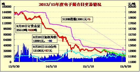 9月28日 電子撮合交易成交8910噸,較上一交易日減少3470噸。訂貨量增加600噸,累計訂貨25510噸。交易各合同開盤低開居多,盤中震蕩下跌為主。其中,MA1601合同均價跌幅較大,其余合同均價除MA1510外跌幅不一。目前,在疆棉企開秤的企業(yè)越來越多,但是大量進(jìn)行收購的企業(yè)卻不多,部分棉花企業(yè)已經(jīng)預(yù)約棉花入庫公證檢驗,受今年棉花經(jīng)營難度增加及棉花質(zhì)量下降的影響,企業(yè)收購進(jìn)度比較慢。臨近節(jié)假,全棉紗節(jié)前補(bǔ)貨氣氛明顯低于預(yù)期,走貨量不佳,棉紡紗廠開工維持低位,多按單生產(chǎn),市場部分商家已基本放棄節(jié)前市場,等待節(jié)后新棉集中上市。
