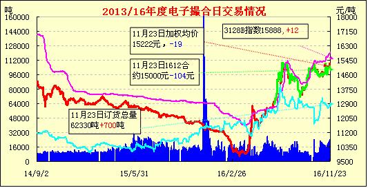 11月23日,電子撮合交易成交量下降,合約均價(jià)多數(shù)收跌,活躍交投主要集于中遠(yuǎn)月合同。近期,山東巨野縣棉花企業(yè)看漲棉花價(jià)格,開始敞開收購。23日,當(dāng)?shù)刈衙奘召弮r(jià)3.95元/斤,衣分率40%,水分13%。另據(jù)了解,部分棉企赴外地采購棉籽,從外省收購的籽棉到廠價(jià)格3.90元/斤左右,衣分率39%,水分12%。
