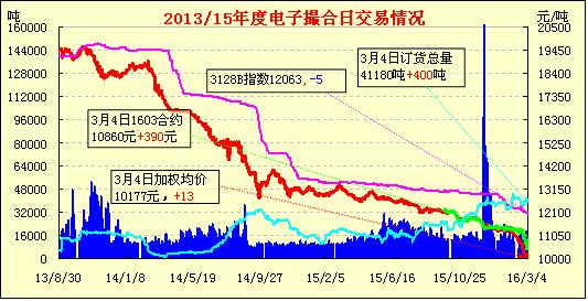 3月4日,電子撮合交易增倉(cāng)縮量,近月上漲。近月合同均價(jià)與中國(guó)棉花價(jià)格指數(shù)價(jià)差擴(kuò)至1208元/噸,價(jià)差較昨日1598元/噸有所縮小。今日交易總量11740元/噸,較昨日減少440噸,訂貨總量41180,增加400噸。近月MA1603合同均價(jià)上漲并首超期貨CF603合約結(jié)算價(jià)。MA1603合同均價(jià)10860元/噸,成交量與均價(jià)上漲,與期貨CF603合約結(jié)算價(jià)10725元/噸,價(jià)差135元,首次超過期貨近月合約結(jié)算價(jià)。訂貨量近減遠(yuǎn)增,當(dāng)日MA1604訂貨量與昨日持平,其余各合同訂貨量為近減遠(yuǎn)增。其中,近月合同MA1603與MA1605訂貨量分別減少310噸、470噸,遠(yuǎn)月MA1606、MA1607、MA1608合同訂貨量均有不同程度增加。增幅最高為MA1607合同,訂貨量增加600噸。當(dāng)前國(guó)儲(chǔ)棉輪出政策遲遲沒有明確消息的支撐,現(xiàn)貨市場(chǎng)跌幅趨弱,紡織企業(yè)采購(gòu)積極性較差,對(duì)市場(chǎng)繼續(xù)持觀望態(tài)度,等待低價(jià)的到來。棉花企業(yè)出貨意愿較為積極,但當(dāng)前高等級(jí)資源量小,價(jià)格相對(duì)較為堅(jiān)挺。