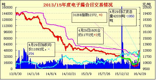 4月29日,電子撮合交易縮量減倉(cāng),均價(jià)漲跌互現(xiàn),盤中交投活躍集中在中、遠(yuǎn)月合同中。現(xiàn)貨掛牌近月合同均價(jià)與鄭棉近月合約價(jià)差323元。當(dāng)日現(xiàn)貨掛牌交易有以下特點(diǎn):成交量繼續(xù)縮減,近月合同MA1605交投較不活躍,中遠(yuǎn)期合同成交量相對(duì)較高。訂貨量小幅減少。當(dāng)日遠(yuǎn)期合同MA1610持倉(cāng)不變,其余各合同均出現(xiàn)減持。均價(jià)漲跌互現(xiàn)。近月合同均價(jià)持穩(wěn),各合同跌幅趨緩。