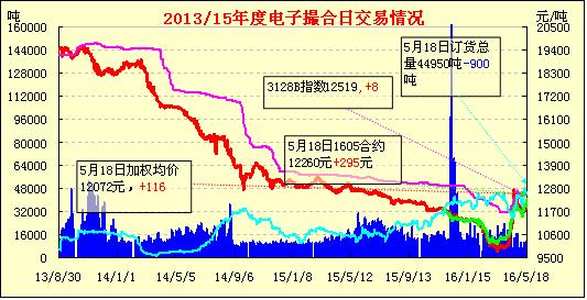 5月18日,電子撮合交易縮量減倉(cāng),各合同均價(jià)全線上漲,多數(shù)合同漲幅在200元/噸之上,盤(pán)中交投活躍集中在中、遠(yuǎn)月合同中,近月合同均價(jià)與鄭棉近月合約價(jià)差230元。當(dāng)前現(xiàn)貨市場(chǎng)價(jià)格堅(jiān)挺,5月15日以來(lái)新疆阿克蘇北部、巴州北部及喀什(含巴楚)大部地區(qū)遭遇罕見(jiàn)的強(qiáng)對(duì)流天氣,風(fēng)力6-7級(jí),氣溫下降5-7度,由于低溫持續(xù)時(shí)間長(zhǎng)、風(fēng)力大,部分鄉(xiāng)鎮(zhèn)棉田受災(zāi)比較重,各地區(qū)、縣鄉(xiāng)農(nóng)業(yè)技術(shù)人員積極指導(dǎo)農(nóng)民防風(fēng)抗災(zāi),抓緊中耕松土及補(bǔ)種、復(fù)播;北疆塔城、精河、沙灣及博樂(lè)、奎屯等棉區(qū)則連續(xù)數(shù)天遭遇降溫、降雨侵襲(塔城17日再遭冰雹襲擊),棉花立枯病、爛苗死苗現(xiàn)象頻發(fā),個(gè)別北疆棉區(qū)補(bǔ)種面積達(dá)到20%左右。