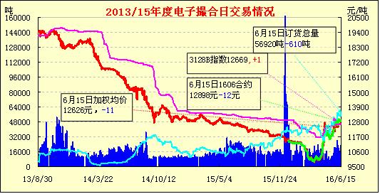 6月15日,電子撮合交易縮量減倉,各合同均價多數(shù)下跌,盤中交投活躍集中在中、遠(yuǎn)月合同中。近期包括新疆生產(chǎn)建設(shè)兵團在內(nèi)2015/16年度疆內(nèi)皮棉銷售進度已達(dá)到90%以上,各軋花廠、疆內(nèi)經(jīng)營商手中的原料庫存寥寥可數(shù),而且剩余皮棉品質(zhì)較低,不符合紡C32S及以上支數(shù)棉紗的配棉需要;再加上國儲棉輪出資源“低、中、高”等級全覆蓋,棉企報價又大幅高于國儲棉競賣價格500-800元/噸,因此現(xiàn)貨成交非常冷清。