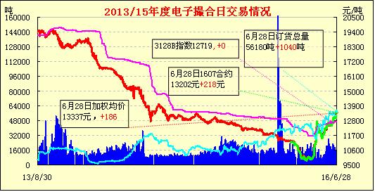 6月28日,電子撮合交易增倉縮量,各合同均價全線收漲,盤中交投活躍集中在中、遠月合同中。現貨市場延續(xù)堅挺局面,商家報價普遍較高,棉花現貨市場報價微漲,江浙地區(qū)倉庫疆棉手摘3128BS2級價格在13300-13350元/噸公定,貿易商前期拍儲棉花利潤已達300-500元/噸。進口棉現貨資源相對較少,價格維持高位,美棉價格在13500-14000元/噸。隨著輪出投放量的持續(xù)減少,也是形成近期逐步上漲因素。