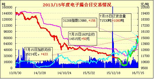 7月15日,電子撮合交易倉量均增,均價(jià)全線收漲,交投活躍集中在中、遠(yuǎn)月合同中?,F(xiàn)貨市場價(jià)格維持高位,3128B疆棉手摘成交價(jià)格在14200-14400元/噸公定,商家讓利空間不大,而高等級(jí)手摘疆棉報(bào)價(jià)在14800-15000元/噸公定,紡企接受高價(jià)壓力較大,主要是目前部分下游紡企前期低價(jià)棉花庫存已消耗差不多,特別是中小企業(yè)備貨不多,近期面臨高價(jià)棉花現(xiàn)貨采購。
