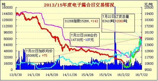 7月22日,電子撮合交易縮量增倉,均價漲跌互現(xiàn)?,F(xiàn)貨掛牌近月合同均價與鄭棉期貨近月合約價差466元/噸?,F(xiàn)貨市場高位調(diào)整,等級不同價格略有差距,整體報價較高,據(jù)悉有質(zhì)量較好新年度棉花報價在16300-16500元/噸左右,而儲備棉商談15100-15800元/噸左右,澳棉商談16700-16800元/噸,紗廠采購高價棉花有抵觸情緒。因降雨增加、產(chǎn)量看增,紡企對外棉采購增加等影響,昨印度棉花價格首度下跌,其S6扎花廠提貨價折90美分/磅,且CCI決定開放庫存以低于市場價銷售給小紡企,但量有限。