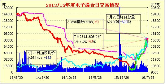 7月25日,電子撮合交易增量減倉,均價多數(shù)下跌,交投活躍集中在中、遠(yuǎn)月合同中。據(jù)了解,雖然7月18日以來鄭棉、ICE期棉振蕩回調(diào),國儲棉成交均價也回調(diào)300元/噸,但國內(nèi)2015/16年度新疆手采棉現(xiàn)貨3128B報價卻穩(wěn)定在15000-15200元/噸(內(nèi)地庫),實際成交稍低50-150元/噸。2012、2013年度國儲棉報價低于新棉300-400元/噸,現(xiàn)貨表現(xiàn)出很強的抗跌性。據(jù)本網(wǎng)信息員了解,近日,石河子、阿克蘇等地一些紡企表示,由于疆內(nèi)倉庫2015/16年度棉花可選擇的貨源少之又少,而且價格嚴(yán)重透支了紗廠的消化能力;而國儲棉新疆庫點有限,遠(yuǎn)距離運輸皮棉成本又大幅增加,因此計劃完成5、6月份接的訂單后,有些紡企選擇減產(chǎn)或停產(chǎn)。對于棉花能漲到什么價位,能漲到8月底還是9月底,紡織企業(yè)難以判斷,目前對于交貨期長、壓價大的訂單不敢接。