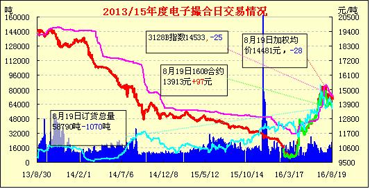 8月19日,電子撮合交易增量減倉,均價(jià)有漲有跌,交投活躍集中在近月合同中。現(xiàn)貨市場調(diào)整,市場成交稀少,紡企拍儲(chǔ)為主,內(nèi)地庫15/16年度3128B手摘棉報(bào)價(jià)在15000-15300元/噸公定,機(jī)采棉價(jià)格在14500-14800元/噸。而儲(chǔ)備棉轉(zhuǎn)售價(jià)格略低,在13500-14500元/噸之間。據(jù)悉,新疆喀什等地有少量新年度籽棉上市,個(gè)別廠家開秤收購,目前價(jià)格在6.5元/公斤左右統(tǒng)花,較去年略有小幅提升,目前價(jià)格折合皮棉成本在13900元/噸左右(40%衣分)。