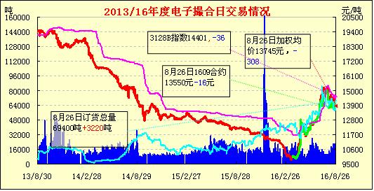 8月26日,電子撮合交易增倉縮量,均價全線收跌,交投活躍集中在近月合同中。受鄭棉期貨大跌影響,棉花現(xiàn)貨市場悲觀情緒升濃,市場買家響應(yīng)不多,呈有價無市狀態(tài),11年度山東地產(chǎn)儲備棉轉(zhuǎn)售報價在13200-13300元/噸左右。長絨棉市場因新年度增產(chǎn)預(yù)期,山東等地報價弱勢,且讓利空間增大,內(nèi)地庫地方企業(yè)137級報價在20800-21200元/噸。近日阿克蘇軋花廠陸續(xù)開秤收購籽棉,開秤價6.5元/公斤,但南疆軋花廠普遍認(rèn)為此價高于預(yù)期。而阿拉爾市遭遇冰雹襲擊,但整體產(chǎn)量影響不大,整體采摘期推遲。