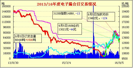 9月5日,電子撮合交易倉量均增,均價(jià)收陰線,交投活躍集中在近月合同中?,F(xiàn)貨市場(chǎng)弱勢(shì)調(diào)整,國儲(chǔ)轉(zhuǎn)讓為主,成交不佳,地產(chǎn)棉主流報(bào)價(jià)在12900-13200元/噸公定自提,而山東等地15/16年度2128級(jí)棉花價(jià)格在14400-14600元/噸。據(jù)悉,新疆庫爾勒部分軋花廠開秤,價(jià)格在6.3元/公斤(衣分40%),整體品質(zhì)較佳,但水分偏高,折合皮棉價(jià)格在14000元/噸左右(按棉籽2.5元/公斤計(jì)算)。