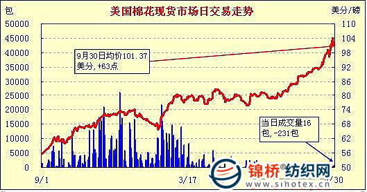 錦橋紡織網(wǎng)—資訊頻道> 棉花信息> 美棉現(xiàn)貨>正文 美國棉花現(xiàn)貨市場行情(10-9-30)
