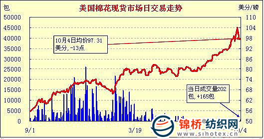 錦橋紡織網(wǎng)—資訊頻道> 棉花信息> 美棉現(xiàn)貨>正文 美國棉花現(xiàn)貨市場行情(10-10-4)