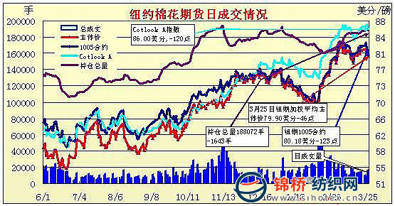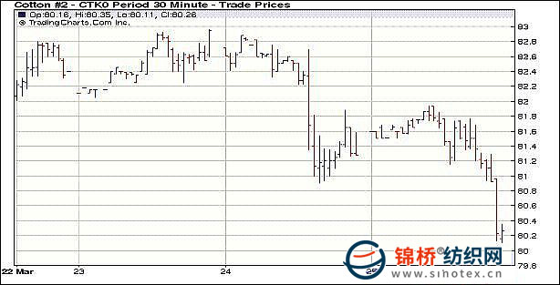 3月25日紐約期棉再度大幅收跌,外圍市場拖拽加之美棉出口回落使價格下滑,主力合約收于兩周來低點。當(dāng)日市場平開后一度小幅走高,5月合約最高至81.94美分/磅。午盤后由于美元走強,商品市場疲軟,拖拽期棉價格下滑,并觸發(fā)止損賣盤;此外,上周美棉簽約出口量回落至2萬噸,低于市場預(yù)期,也為棉市帶來利空。盤終5月合約收于80.18美分/磅,跌123點,為兩周來最低點;7月合約收于81.27美分/磅,跌99點;其它遠期合約小幅收漲。 紐約棉花期貨近期1005合約近三個交易日交易走勢 |