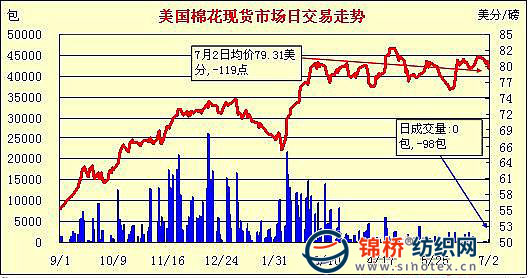 錦橋紡織網—資訊頻道> 棉花信息> 美棉現(xiàn)貨>正文 美國棉花現(xiàn)貨市場行情(7-2)