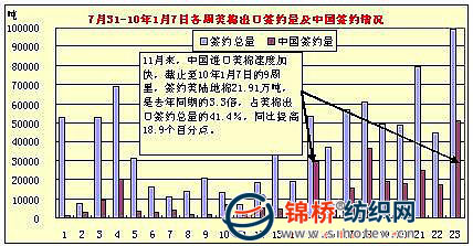 據(jù)美國(guó)農(nóng)業(yè)部(USDA)公布,2010年1月1日至1月7日美國(guó)凈簽約出口09/10年度陸地棉99201噸,為本年度最高,較前周增加1.2倍;裝運(yùn)本年度陸地棉41096噸,較前周增81%。當(dāng)周凈簽約出口本年度皮馬棉839噸,為年度來(lái)最低,較前周減71%。裝運(yùn)本年度皮馬棉5035噸,較前周減37%。此外,還凈簽約出口2010/11年度皮馬棉839噸。 當(dāng)周中國(guó)凈簽約進(jìn)口本年度陸地棉50961噸,是上一周2.9倍,占當(dāng)周美陸地棉簽約總量的51.4%;裝運(yùn)18484噸,是上一周的6.8倍。凈簽約進(jìn)口本年度皮馬棉249噸,裝運(yùn)2563噸。當(dāng)周中國(guó)取消2010/11年度皮馬棉合約953噸。 本年度陸地棉簽約出口至中國(guó)(50961噸)、土耳其(14243噸,包括1157噸轉(zhuǎn)簽自中國(guó))、越南(5352噸)、泰國(guó)(4921噸,包括227噸轉(zhuǎn)簽自日本)、中國(guó)臺(tái)灣(3992噸)。 本年度陸地棉裝運(yùn)至中國(guó)(18484噸)、土耳其(6260噸)、越南(4990噸)、墨西哥(2291噸)、印尼(1996噸)、泰國(guó)(1837噸)。 本年度皮馬棉簽約出口至德國(guó)(295噸)、中國(guó)(249噸)和巴基斯坦(204噸)。 本年度皮馬棉裝運(yùn)至中國(guó)(2563噸)、印度(885噸)、巴基斯坦(567噸)、德國(guó)(408噸)和埃及(386噸)。 自11月來(lái),中國(guó)進(jìn)口美棉速度加快,截止至10年1月7日的9周里,簽約美陸地棉21.91萬(wàn)噸,是去年同期的3.3倍,占美棉出口簽約總量的41.4%,同比提高18.9個(gè)百分點(diǎn)。 |