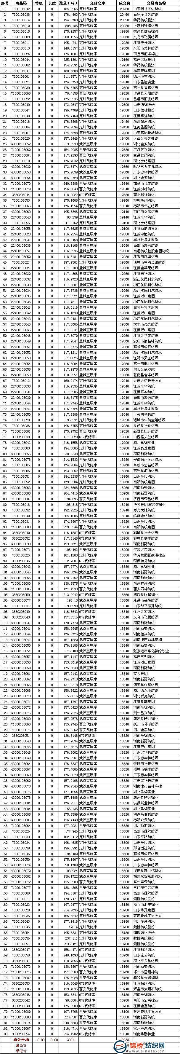 五是當(dāng)日最高成交價(jià)20480元/噸,共計(jì)184噸,承儲(chǔ)定州代儲(chǔ)庫(kù),由山東陽(yáng)谷順達(dá)紡織有限公司競(jìng)得;最低成交價(jià)18540元/噸,共計(jì)234噸,承儲(chǔ)在672代儲(chǔ)庫(kù)站,由河南省華鵬棉業(yè)有限責(zé)任公司競(jìng)得。