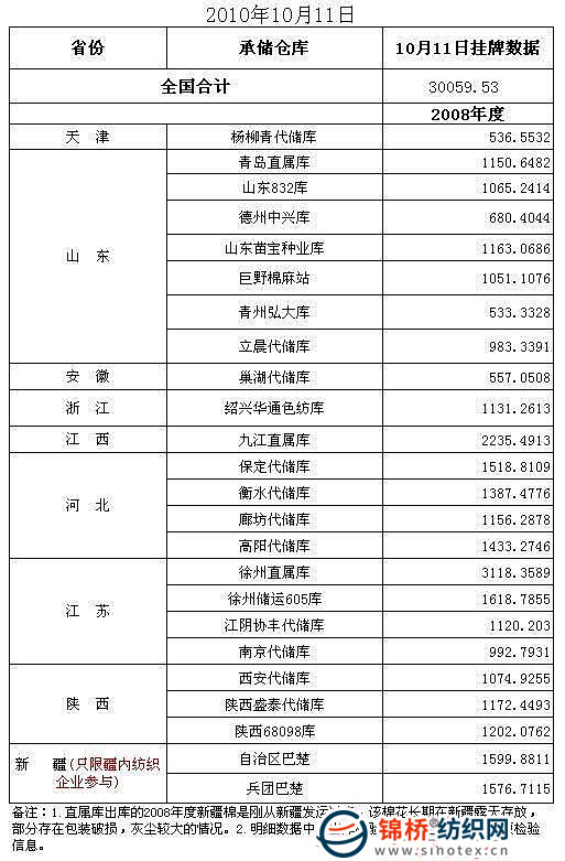 各紡織用棉企業(yè): 10月11日計劃投放儲備棉30059.53噸,以下為投放庫點具體數(shù)據(jù)情況: