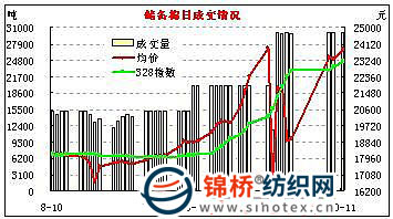 10月11日儲備棉投放數(shù)量30060噸,歷時約十二個半小時全部成交。平均等級3.94,與9日持平,平均長度28.41,較9日高0.02,加權(quán)均價23843元/噸,較9日漲546元/噸,折328級成交價為24415元/噸,較9日漲549元/噸。 當(dāng)日交易的主要特點: