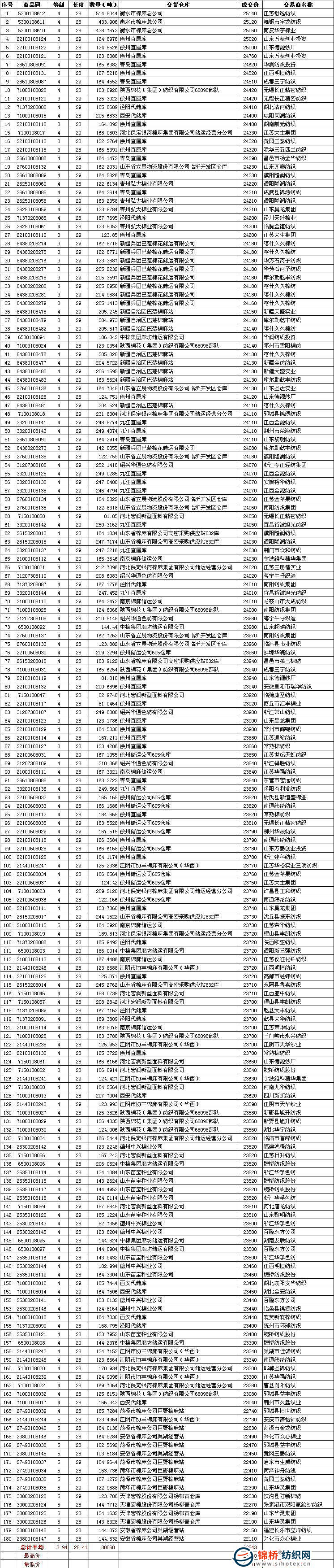 五是當(dāng)日最高成交價25140元/噸,平均品級428級,共計515噸,承儲在衡水市棉麻總公司,由江蘇舒逸紡織有限公司競得;最低成交價22110元/噸,平均品級528級,共計145噸,承儲在安徽省棉麻公司巢湖經(jīng)營站,由興化市眾心棉業(yè)有限公司競得。