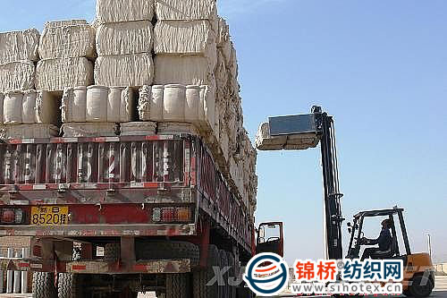 10月19日,新疆吐魯番1個(gè)棉花收購站的工人用叉車裝運(yùn)棉花包。 |