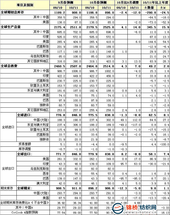 2010/11年度,全球棉花期末庫存906萬噸,比上年度增加9.8萬噸,增幅1.1%。其中美國期末庫存52萬噸,同比減少13.3萬噸,減幅20.4%;中國期末庫存291萬噸,減少2.7萬噸,減幅0.9%。 國際棉花咨詢委員會(huì)全球棉花產(chǎn)需預(yù)測(10月) |