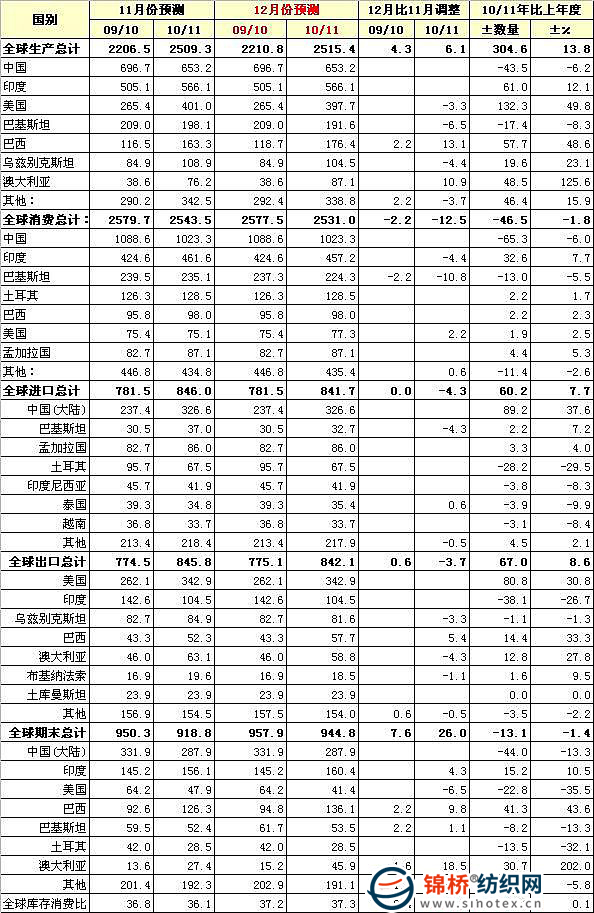 12月10日,美國農(nóng)業(yè)部(USDA)公布了2010/11年度全球棉花產(chǎn)銷存預(yù)測。 一、與上個月相比,主要變化如下: