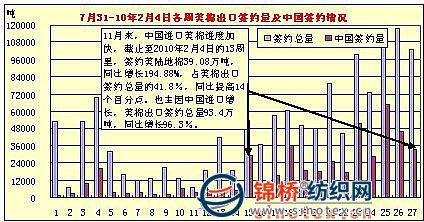 11月來(lái),中國(guó)進(jìn)口美棉進(jìn)度加快,截止至2010年2月4日的13周里,簽約美陸地棉39.08萬(wàn)噸,同比增長(zhǎng)194.88%,占美棉出口簽約總量的41.8%,同比提高14個(gè)百分點(diǎn)。也主因中國(guó)進(jìn)口增長(zhǎng),美棉出口簽約總量93.4萬(wàn)噸,同比增長(zhǎng)96.3%。 |