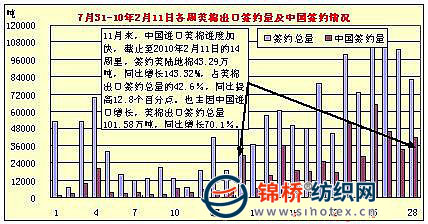 據(jù)美國農(nóng)業(yè)部(USDA)公布,2.5-2.11一周美國凈簽約出口09/10年度陸地棉81760噸,較前一周減少21%,較近四周平均值減少19%。裝運本年度陸地棉46902噸,較前一周增加19%,較近四周平均值增加11%。凈簽約出口09/10年度皮馬棉2926噸,較前一周增加41%,較近四周平均值增加42%。裝運本年度皮馬棉2699噸,較一周減46%,較近四周平均值減43%。此外,10/11年度陸地棉凈簽約量為負的7462噸。 11月來,中國進口美棉進度加快,截止至2010年2月11日的14周里,中國簽約美陸地棉43.29萬噸,同比增長143.32%,占美棉出口簽約總量的42.6%,同比提高12.8個百分點。因中國進口增長,此間,美棉出口簽約總量達101.58萬噸,同比增長70.1%。 |