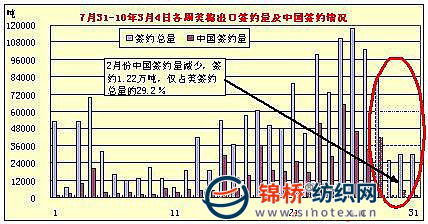 2月份來,受國際棉價(jià)飚漲及節(jié)假日影響,中國進(jìn)口美棉簽約量一改11月份大幅增長為大幅減少。2月份中國僅簽約1.22萬噸,占美棉出口簽約總量的比重由前期的41.8%下降至2月份的29.2%。