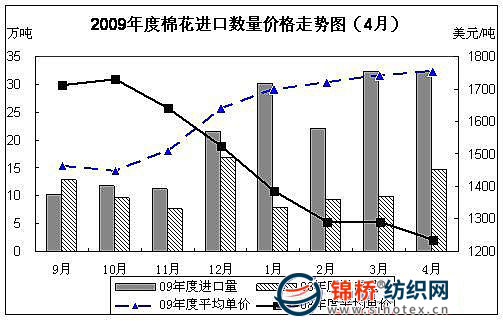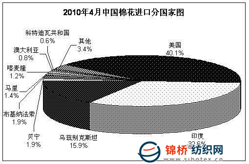 4月份,印度政府為保證其國內(nèi)紡織用棉,先后實施加征棉花出口稅和無限期暫停棉花出口登記的限制棉花出口政策。受此影響,國際棉花現(xiàn)貨價格大幅上漲,CotlookA指數(shù)創(chuàng)1995年10月以來最高。當(dāng)月我國棉花進(jìn)口總量保持高位,與上月基本持平,其中關(guān)稅內(nèi)配額進(jìn)口占半數(shù)以上。各主要來源國中,由于印度調(diào)整了棉花出口政策,當(dāng)月進(jìn)口印度棉數(shù)量有所下降,退居第二位;進(jìn)口美棉繼續(xù)增加,上升為第一位。 據(jù)海關(guān)統(tǒng)計,4月我國進(jìn)口棉花32.4萬噸,與3月基本持平,較去年同期增長1.2倍;進(jìn)口價格繼續(xù)上漲,月平均1755美元/噸,較3月上漲0.76%,同比上漲41.8%。2010年前4個月累計進(jìn)口棉花117萬噸,同比增長1.8倍。2009年度前8個月累計進(jìn)口棉花172萬噸,同比增長94.4%。