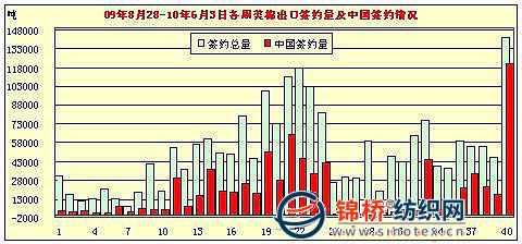據(jù)美國農(nóng)業(yè)部(USDA)公布,5.28-6.3一周,美國凈簽約出口2009/10年度陸地棉141566噸,為年度來最高,較前周增加2倍;裝運(yùn)51188噸,較前周減31%,較近四周平均值減21%。凈簽約出口本年度皮馬棉68噸,為年度來最低,較前周減76%,較近四周平均值減87%;裝運(yùn)431噸,較前周減56%,較近四周平均值減57%。此外凈簽約出口2010/11年度陸地棉45064噸,簽約皮馬棉204噸。 當(dāng)周簽約進(jìn)口本年度陸地棉的國家有中國(120973噸)、墨西哥(7348噸)、土耳其(4286噸)、中國臺灣(3130噸,包括45噸轉(zhuǎn)簽自土耳其)、泰國(2790噸,包括91噸轉(zhuǎn)簽自日本),凈簽約為負(fù)數(shù)的國家有韓國(-1383噸)和越南(-1338噸)。