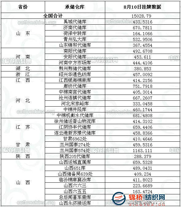 8月10日計劃投放2008年度儲備棉15028.79噸,以下是拋儲庫點投放情況: