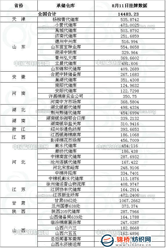 各紡織用棉企業(yè): 8月11日計劃投放儲備棉14483.23噸,以下為投放庫點具體數(shù)據(jù)情況: