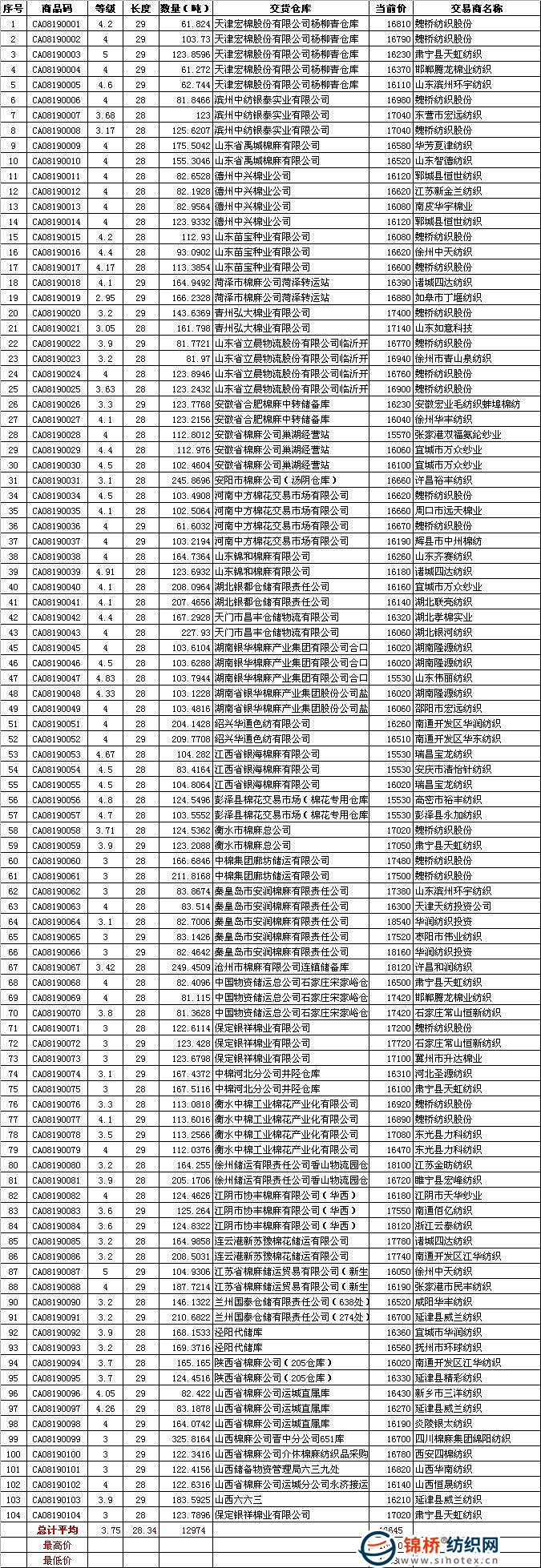 8月19日儲(chǔ)備棉投放數(shù)量為13974噸,由于報(bào)價(jià)稀少,16:40系統(tǒng)正常閉市,1000噸資源流拍,實(shí)際成交量12974噸。平均等級(jí)3.75,較上一日提高0.06;平均長(zhǎng)度28.34,提高0.02;加權(quán)成交價(jià)16645元/噸,較上一日低1035元,折328級(jí)成交價(jià)為16960元/噸,較上一日低1095元。最高成交價(jià)18540元/噸,較昨日低280元,最低成交價(jià)15530元/噸,低1070元。