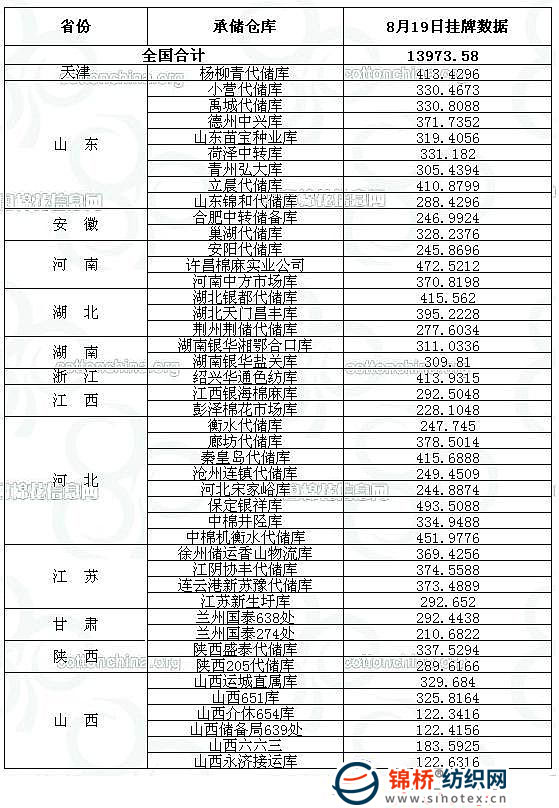 各紡織用棉企業(yè): 8月19日計劃投放儲備棉13973.58噸,以下為投放庫點具體數(shù)據(jù)情況: