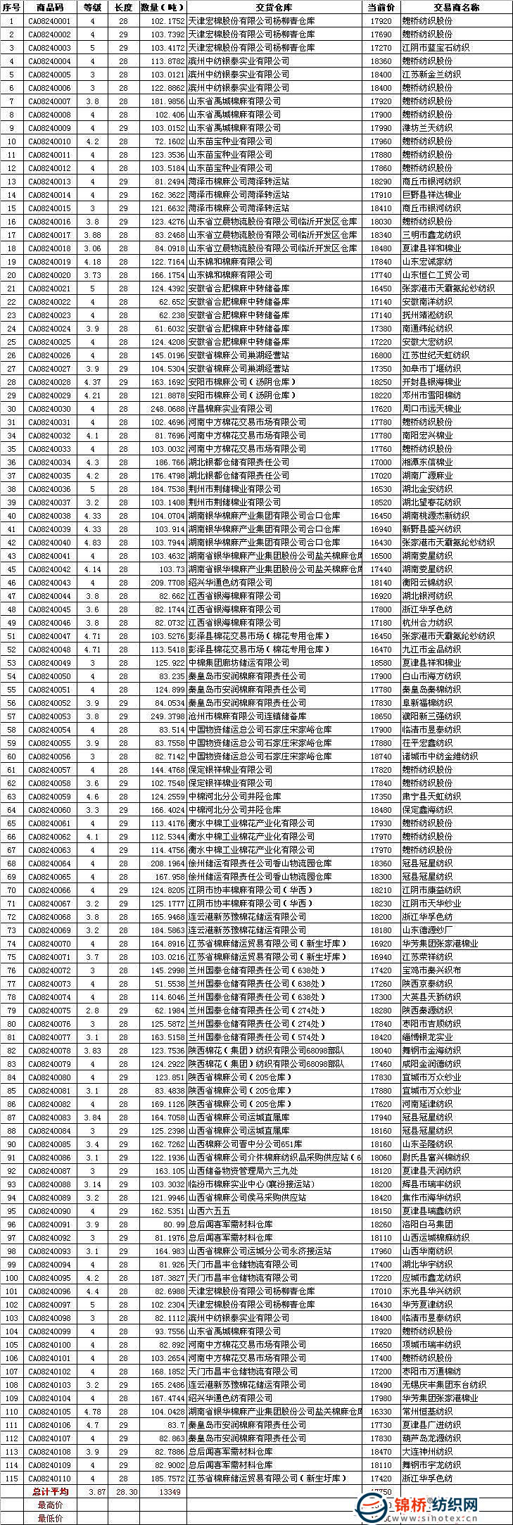 8月24日儲備棉投放數(shù)量為13349噸,全部成交;平均等級3.87,較上一日(下同)低0.12;平均長度28.30,與上一日持平;加權(quán)成交價17750元/噸,高61元,折328級成交價為18161元/噸,高125元。338家交易商參與競賣,減少12家,79家企業(yè)最終成交,增加21家,成交企業(yè)比23.3%,上升6.8個百分點。當日魏橋紡織成交2140噸,占16%,平均等級3.91,高0.09,成交均價17917元/噸,比前一交易日低22元,折328級18359元/噸,低94元。冠縣冠星紡織成交666噸,平均等級3.77,成交均價18203元/噸,折328級18599元。當日競賣主要特點: 一、當日最高成交價18740元/噸,平均品級328級,共計83噸,承儲在中國物資儲運總公司石家莊宋家峪倉庫,由諸城市中紡金維紡織有限公司競得;最低成交價16330元/噸,平均品級528級,共計104噸,承儲在湖南省銀華棉麻產(chǎn)業(yè)集團股份公司鹽關(guān)棉麻倉庫,由常州恒基紡織有限公司競得。