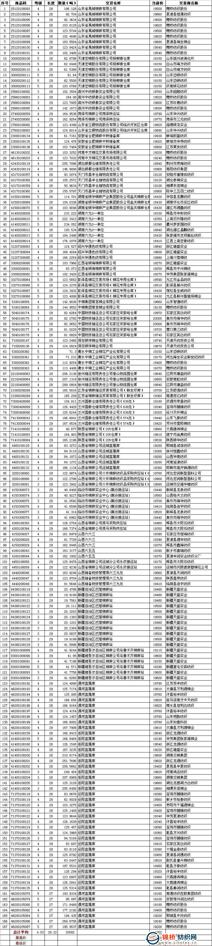 三是當日最高成交價達20000元/噸,平均品級328級,共計164噸,承儲在中國物資儲運總公司石家莊宋家峪倉庫,由焦作市海華紡織股份有限公司競得;最低成交價18250元/噸,平均品級528級,共計83噸,承儲在江西省銀海棉麻有限公司,由輝縣市中州棉紡有限公司競得。 9月13日儲備棉成交明細表 |