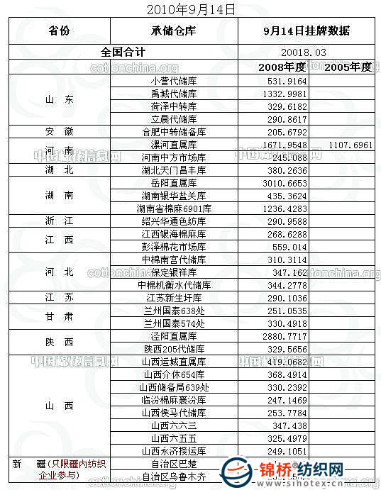 各紡織用棉企業(yè): 9月14日計劃投放儲備棉20018.03噸,以下為投放庫點具體數(shù)據(jù)情況: