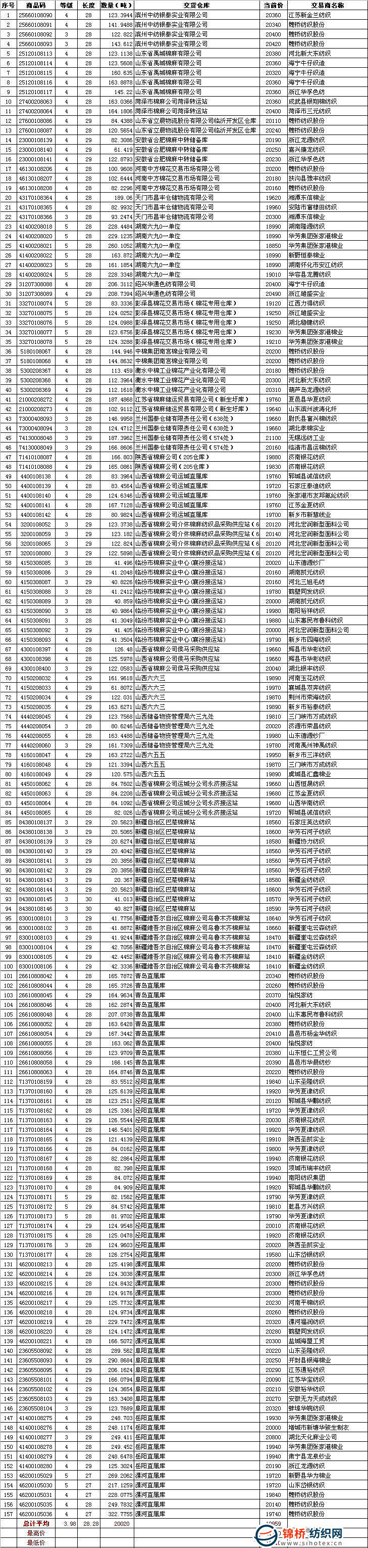 三是當日最高成交價21100元/噸,平均品級329級,共計187噸,承儲在蘭州國泰倉儲有限責任公司(574處),由遠紡工業(yè)(無錫)有限公司競得;最低成交價18410元/噸,平均品級429級,共計85噸,承儲在新疆維吾爾自治區(qū)棉麻公司烏魯木齊棉麻站,由新疆金紡紡織股份有限公司競得。
