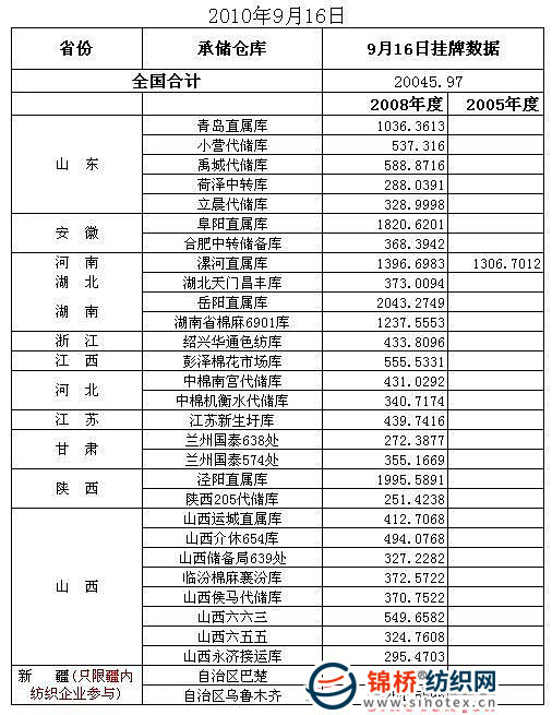 各紡織用棉企業(yè): 9月16日計劃投放儲備棉20045.97噸,以下為投放庫點具體數(shù)據(jù)情況:
