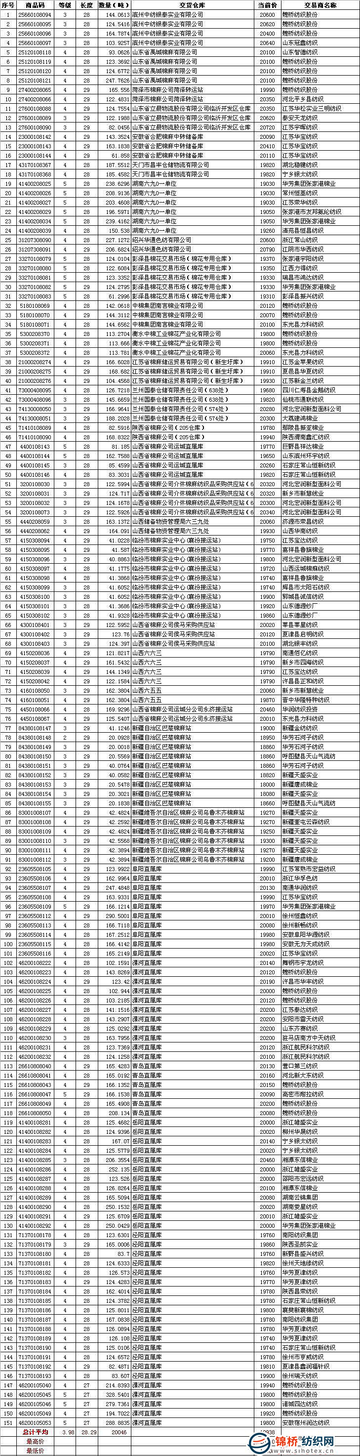 三是當日最高成交價20790元/噸,平均品級429級,共計207噸,承儲在紹興華通色紡有限公司,由江陰市華西紡織廠競得;最低成交價18000元/噸,平均品級329級,共計20噸,承儲在新疆自治區(qū)巴楚棉麻站,由新疆唐成棉業(yè)有限公司競得。