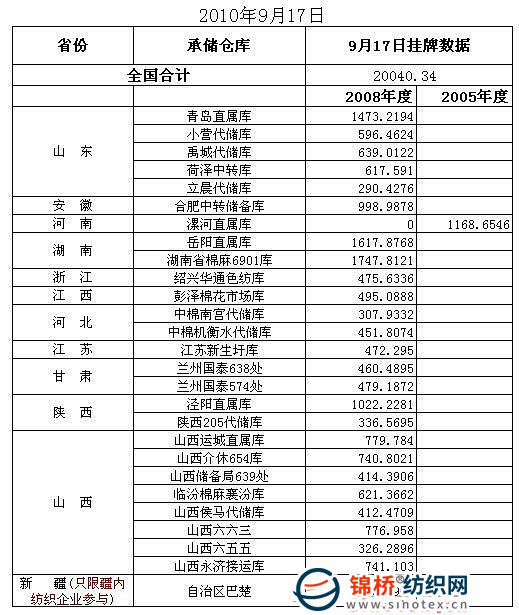 各紡織用棉企業(yè): 9月17日計劃投放儲備棉20040.34噸,以下為投放庫點具體數(shù)據(jù)情況: