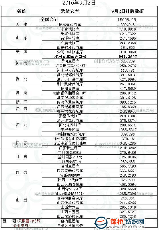 各紡織用棉企業(yè): 9月2日計劃投放儲備棉15098.95噸,以下為投放庫點具體數(shù)據(jù)情況: