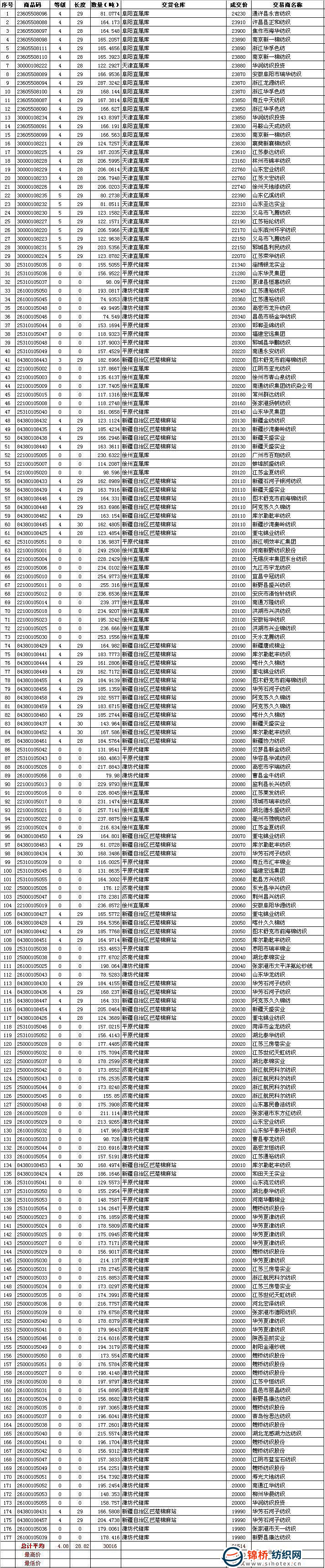 五是當(dāng)日參與投放的掛牌資源中,公檢棉花中3級棉有183噸,占比2%;4級棉有9167噸,占比88%;5級棉1064噸,占比10%。 截止9月28日,儲備棉累計投放市場621260噸,實際成交611660噸,成交率98.5%,完成了投放計劃的61%;所有已成交儲備棉平均等級3.86,平均長度28.34,加權(quán)均價19217元/噸,折328級成交價為19644元/噸。 9月28日儲備棉成交明細(xì)表(按成交價排序) |