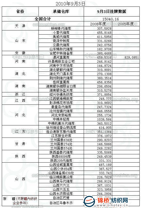 錦橋紡織網(wǎng)—資訊頻道> 棉花信息> 棉花動(dòng)態(tài)>正文 9月3日儲(chǔ)備棉投放預(yù)告:計(jì)劃投放15040噸