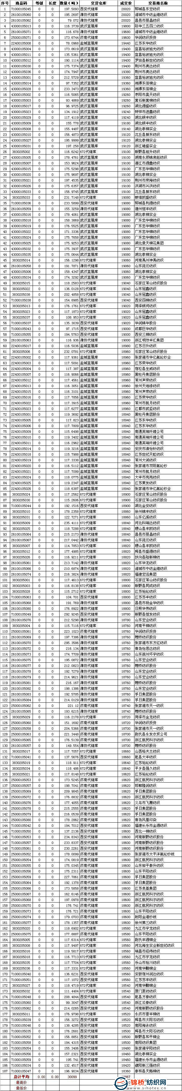 四是當(dāng)日最高成交價20020元/噸(比28日最高價低4210元),承儲在西安代儲庫,由鄆城縣東宏紡織有限責(zé)任公司競得;最低成交價18360元/噸(比28日最低價低1620元),承儲在西安代儲庫,由泰和縣天鵝棉紡有限公司競得。