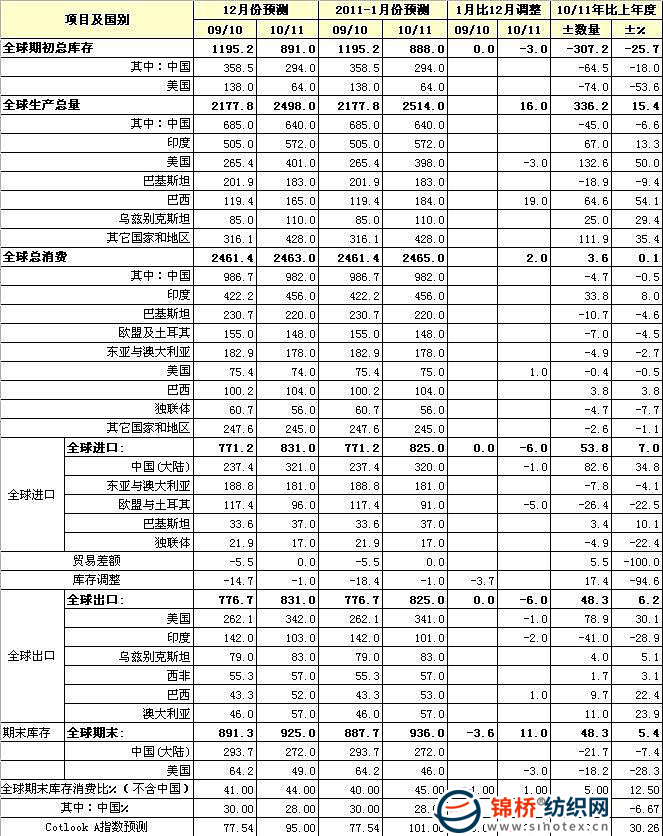 據(jù)據(jù)ICAC最新預(yù)測,2010/11年度全球棉花產(chǎn)量將同比增長15.4%至2514萬噸,供應(yīng)偏緊及較高的價(jià)格在一定程度上限制了消費(fèi),預(yù)計(jì)本年度全球消費(fèi)量為2465萬噸,與上年度基本持平。 預(yù)計(jì)中國本年度棉花產(chǎn)量640萬噸,消費(fèi)982萬噸,產(chǎn)需缺口達(dá)342萬噸,產(chǎn)需缺口率達(dá)34.8%。因此預(yù)計(jì)中國本年度將進(jìn)口320萬噸,占全球棉花進(jìn)口總量825萬噸的38.8%。但因全球第二大棉花出口國印度控制棉花出口,預(yù)計(jì)印度在其棉花產(chǎn)量增加67萬噸至572萬噸的情況下,出口卻較上年度減少41萬噸至101萬噸。而美國在本年度產(chǎn)量增加132.6萬噸至398萬噸的同時(shí),棉花出口將增加78.9萬噸至341萬噸。因此中國棉花進(jìn)口的主渠道仍將以美棉為主。根據(jù)預(yù)測,至2010年12月底,美國已凈簽約出口本年度棉花超過310萬噸,可供資源逐步趨緊,導(dǎo)致國際棉價(jià)持續(xù)上揚(yáng)。ICAC最新預(yù)測本年度CotlookA指數(shù)平均值為101美分/磅,較上年度增長30%。 國際棉花咨詢委員會(huì)全球棉花產(chǎn)需預(yù)測(2011年1月)