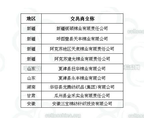 2011年度臨時收儲第三十批已審核交易商來自全國5個主產(chǎn)區(qū),共計9家。詳細(xì)名單如下: